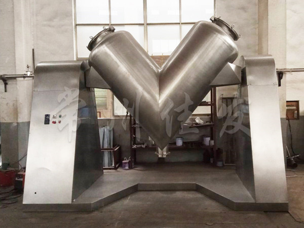 該機(jī)通過機(jī)械傳動(dòng),使不對(duì)稱的V型圓柱體內(nèi)的物料做往復(fù)翻動(dòng),達(dá)到均勻混合之目的。