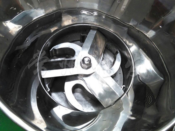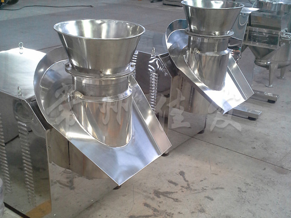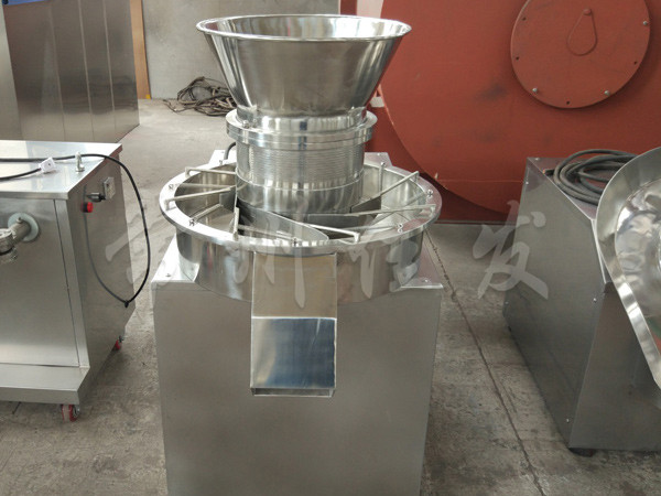 本機(jī)是通過(guò)一組旋轉(zhuǎn)碾刀,將前道工序制成的濕材注入環(huán)碾刀的不銹鋼篩筒篩孔中,從而制成圓柱狀的濕顆粒,供下道工序拋丸使用。本設(shè)備可通過(guò)更換不銹鋼篩筒來(lái)取得不同大小的顆粒。