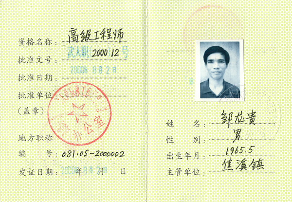 高級工程師證書