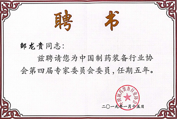 制藥裝備協(xié)會專家委員聘書