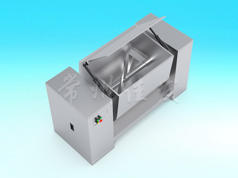 該機通過機械傳動,使不對稱的V型圓柱體內(nèi)的物料做往復(fù)翻動,達到均勻混合之目的。